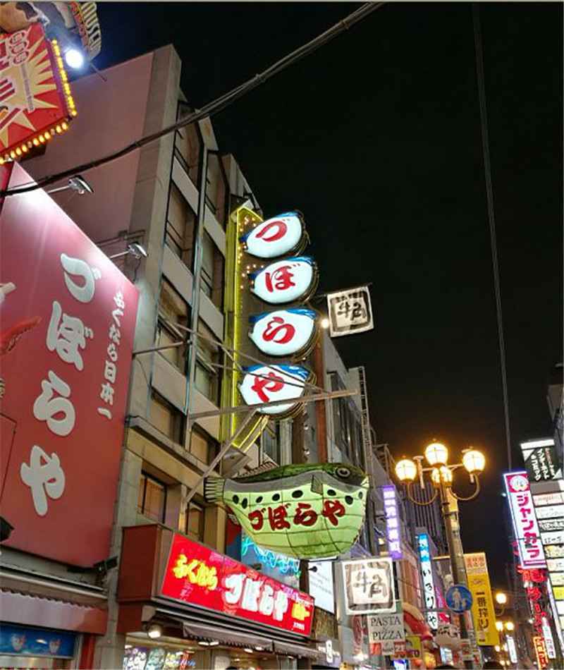 心斋桥 ,道顿崛美食街,大阪美食的代表地点。在这里各种美食的招牌每天都招来川流不息的人潮,最有名的大螃蟹招牌更是道顿崛美食街的标志,尤其是当夜晚来临,闪烁的霓虹灯更是诱人。